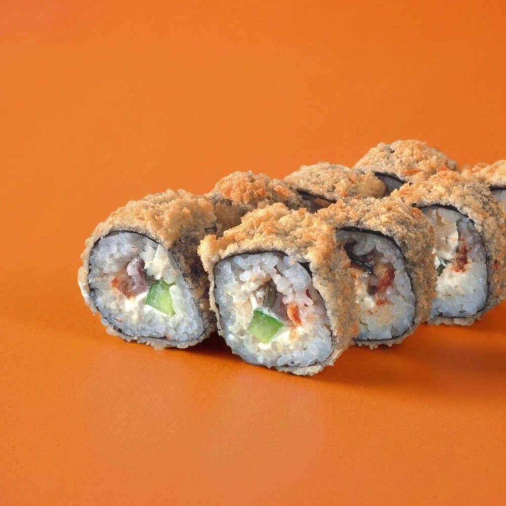рис, нори, кляр, панировочные сухари, сыр творожный, огурец, угорь