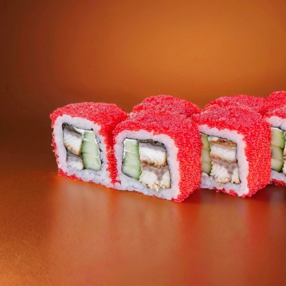 рис, нори, угорь, огурец, майонез, масаго красная