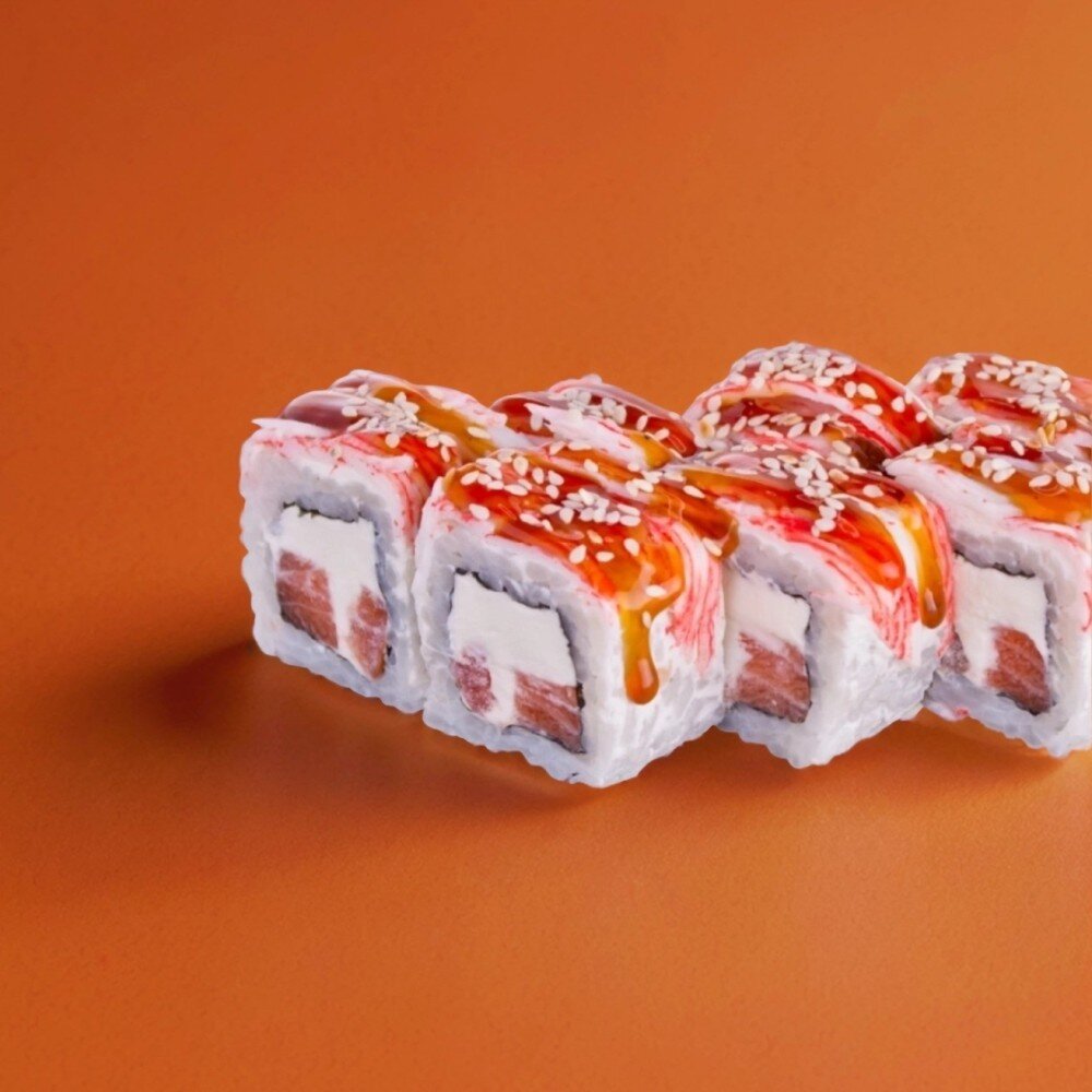 рис, нори, лосось, краб, помидор, сыр творожный, кунжут, унаги соус