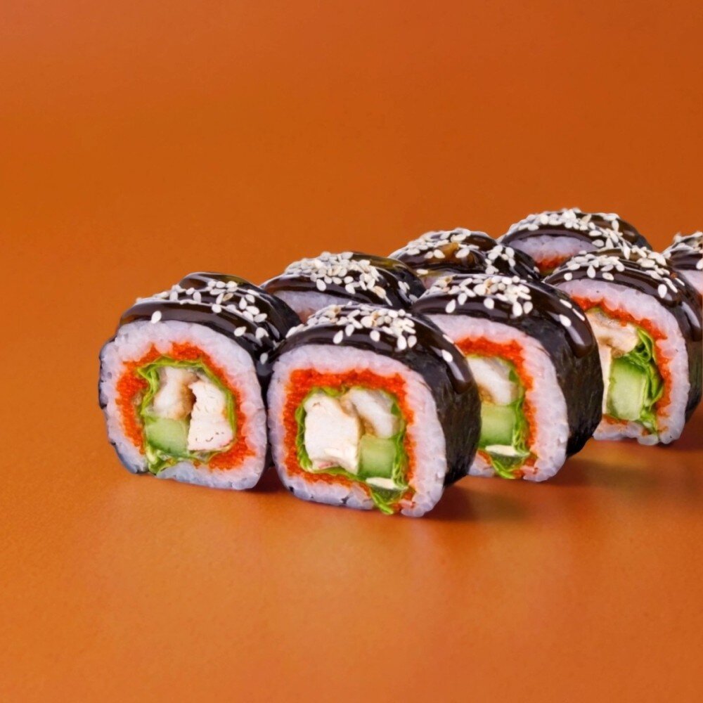 рис, нори, кларий угревидный, краб,огурец, лист салата, масаго, соус спайс, кунжут, унаги соус