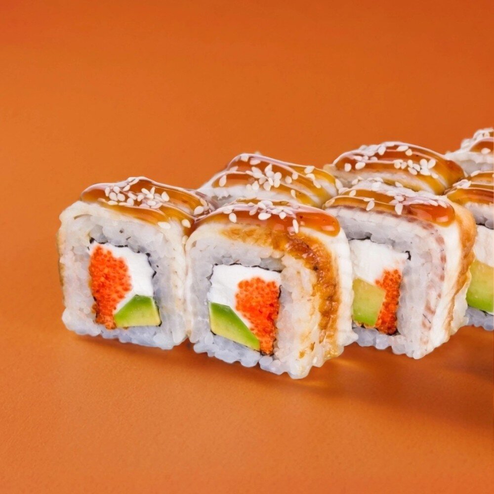 рис, нори, угорь, огурец, масаго, сыр творожный, кунжут, унаги соус
