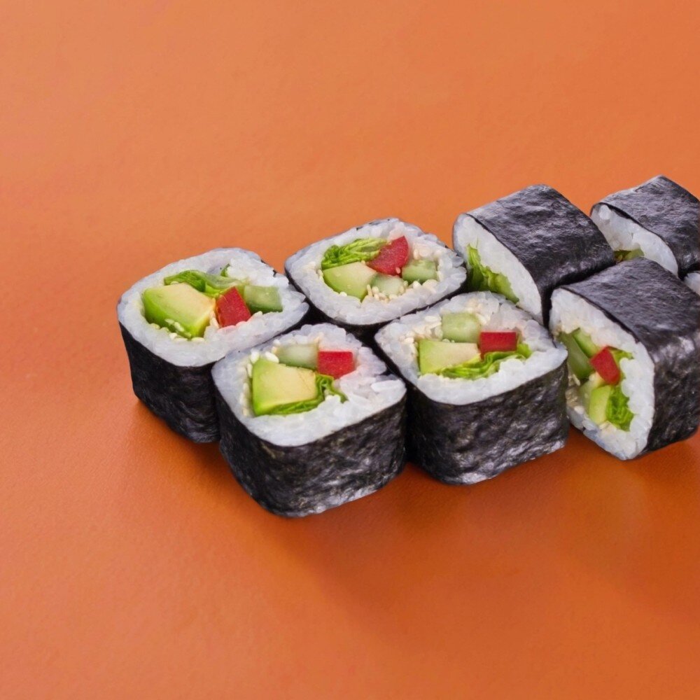 Рис, нори, огурец, перец сладкий, лист салата, кунжут